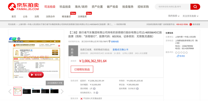 京东拍卖网显示,旅行者汽车集团持有的浙商银行约13.47亿股股票二次拍卖的起拍价约为28.80亿元。