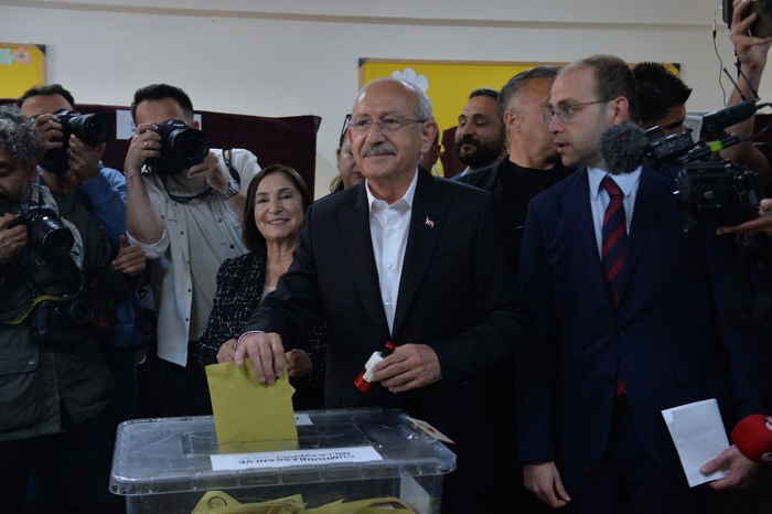 5月14日,在土耳其安卡拉,由6个反对党组成的“民族联盟”阵营候选人凯末尔·克勒奇达尔奥卢(中)在一处投票站投票(图片来源:新华社)