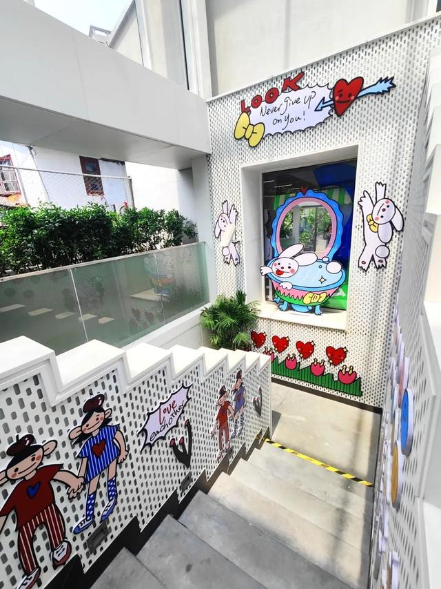 商场正门广场通往地下一层的波点台阶上有AI合影互动,科技感满满;一楼中庭还有很适合拍照的元气大树。