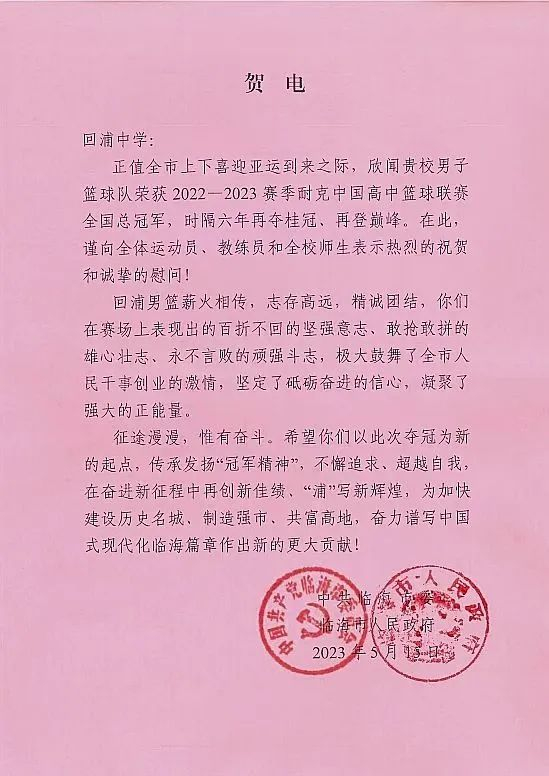 正值全市上下喜迎亚运到来之际,欣闻贵校男子篮球队荣获2022—2023赛季耐克中国高中篮球联赛全国总冠军,时隔六年再夺桂冠、再登巅峰。在此,谨向全体运动员、教练员和全校师生表示热烈的祝贺和诚挚的慰问!