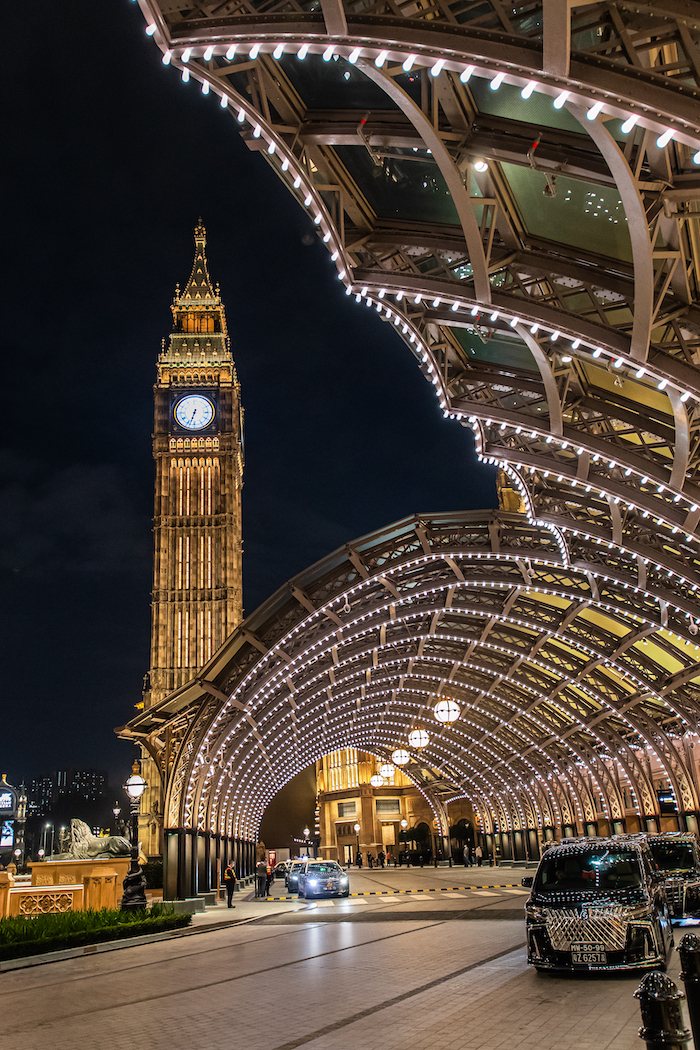 酒店入口的玻璃门廊以伦敦维多利亚车站为建筑蓝本,以鹅卵石走道作点缀,散发着经典英式风情;水晶金殿主要采用玻璃和铁建造,并以大理石铺砌,打造错综复杂的10 层高天花,凸显维多利亚时期的建筑风格;伊丽莎白塔(大本钟)则是按照伦敦标志性建筑原大小建造,钟楼每小时正点及刻钟都会响起钟声;澳门伦敦人酒店外墙设计蓝图及建筑细节源自西敏宫和国会大厦,夜幕降临会随即上演不同主题的伦敦人光效汇演。