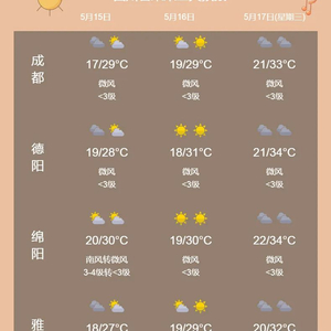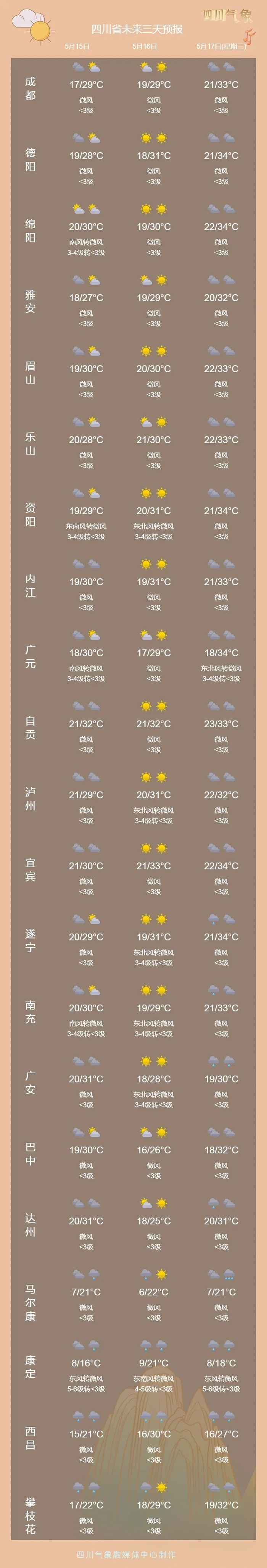 据四川气象,未来三天,盆地大部时段以多云到晴天气为主;川西高原和攀西地区多阵雨或雷雨,15日甘孜州西部和攀西地区西部南部有中雨,局地大雨。