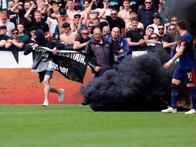 综合法新社、路透社报道,在比赛开始6分钟后,当阿贾克斯的球员准备开角球时,爆炸物落进球场,导致比赛第一次中断。裁判员将两队球员带离球场。不过,当他们返回时,有人再次投掷爆炸物,导致比赛被叫停。此外,还有一名戴着黑色头套并举着侮辱格罗宁根俱乐部管理层横幅的球迷躲过保安跑进球场,随后被保安人员制服带离。14日晚些时候,阿贾克斯俱乐部在其官方网站上表示,比赛的剩余时间将在当地时间16日下午没有球迷观赛的情况下进行。
