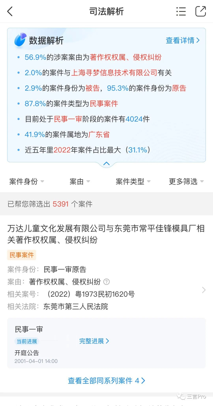 根据天眼查提供的司法解析显示,万达儿童一共涉及高达近5400起司法案件,其中,95.3%案件身份为原告;