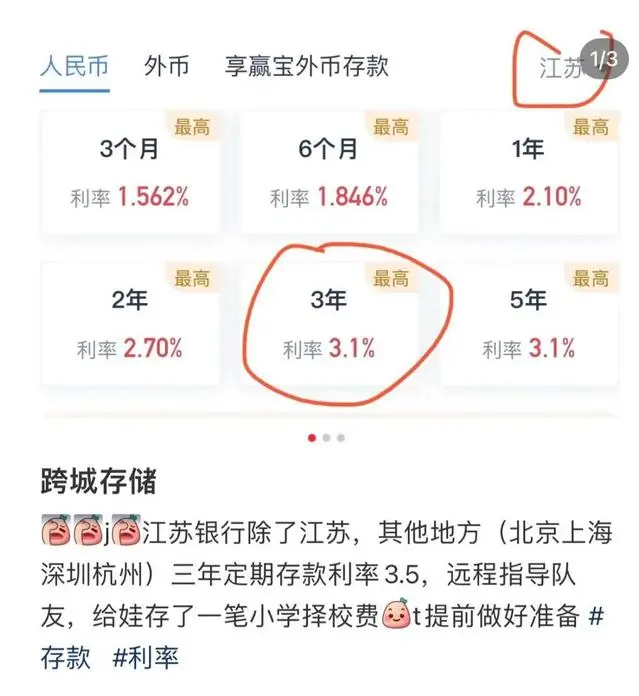 有网友表示,三年期的定期存款,在江苏和上海的利率分别是3.1%和3.5%,存个三五十万,利息差一年就有好几千了。两地交通又方便,刨去异地往返的时间和资金成本,还能够多挣不少利息。