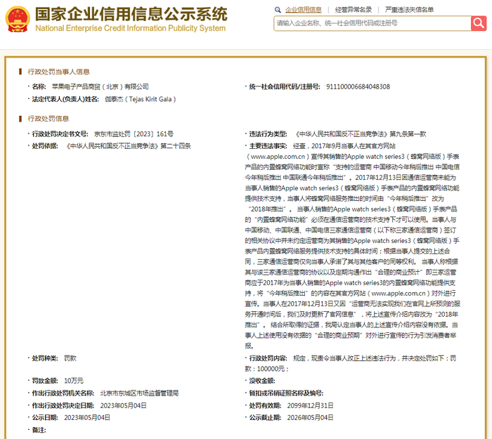 苹果电子产品商贸(北京)有限公司被罚款10万元 中国质量新闻网 2023.05.1515:33 关注 中国质量新闻网讯 据国家企业信用信息公示系统网站消息,近日,北京市东城区市场监管局对苹果电子产品商贸(北京)有限公司作出行政处罚:罚款10万元。