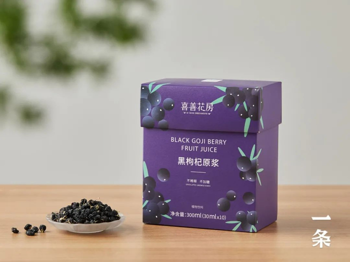 “喜善花房”新推出的这款黑枸杞原浆,不加一滴水,是一款可以直接饮用的饮品好物。