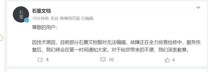 今天下午,云端Office工具石墨文档紧急发布公告: