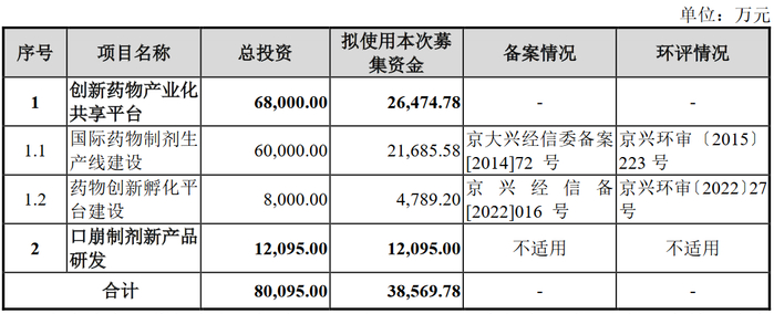 其中,创新药物产业化共享平台包含国际药物制剂生产线建设和药物创新孵化平台建设两部分。国际药物制剂生产线建设方面,目前已建设部分为“一期土建工程”、“二期口崩片生产线及配套工程”的一条产线。本次募集资金拟继续投入建设剩余部分,含扩建5,000万片/年的冻干口崩片速释制剂生产线和200万支/年的长效/超长效缓释制剂生产线;药物创新孵化平台建设项目拟建设抗病毒药物研发实验室、化学合成药物研发实验室、细胞治疗药物研发实验室和酵母平台实验室。本次募集资金拟投入抗病毒药物研发实验室,具备50批/年的病毒筛选服务能力,以及化学合成药物研发实验室,具备50批/年的化合物合成服务能力。