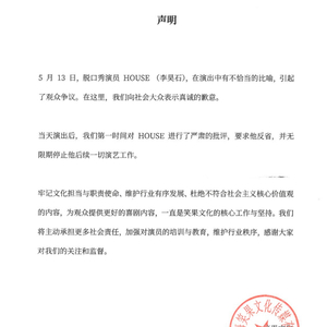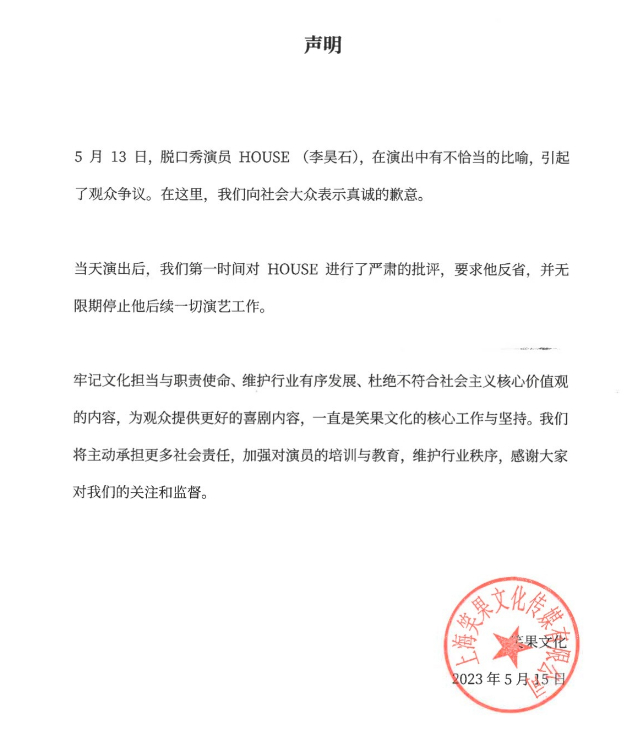 5月15日下午,笑果文化官方社交媒体平台发布声明称,已无限期停止脱口秀演员HOUSE(李昊石)的一切演艺工作。