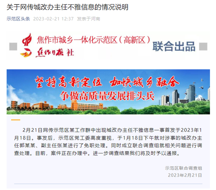 2月21日晚,河南焦作城乡一体化示范区联合调查组发布《关于网传城改办主任不雅信息的情况说明》称,2月21日网传示范区某工作群中出现城改办主任不雅信息一事首发于2023年1月18日。事发后,示范区党工委高度重视,于1月18日下午就对涉事的城改办主任郭某某、副主任张某进行了免职处理。同时成立联合调查组就相关问题进行调查处理。