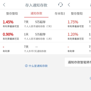 财联社5月15日讯(记者 高萍)部分股份行、中小银行提前宣布自今天起下调通知存款利率后,有大行手机APP也显示,通知存款利率下调30BP,降至自律上限。此外,多家银行暂停销售智能通知存款,亦有银行最高2%的类智能通知存款“下线”。