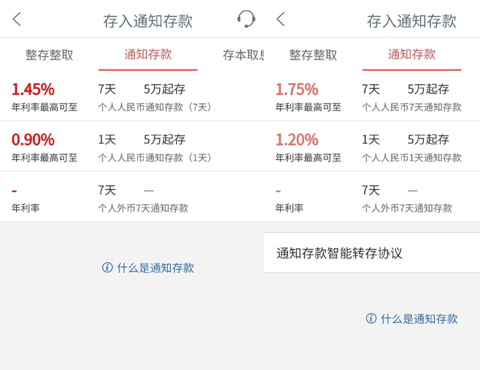 相比较而言,此前通知存款利率加点低于自律上限的银行则未有变化。诸如,5月15日招商银行手机APP显示,该行1天、7天通知存款利率分别为0.45%、1%,与5月15日之前并无变化。另外,也有银行通知存款利率未至上限。诸如,一家河南农商行工作人员介绍,该行免预约7天通知存款利率目前为1.35%。兴业银行手机APP显示,目前该行1天、7天通知存款利率为0.7%、1.25%。另外,该行自5月15日起,智能通知存款(收益型)产品7天利率由2%下调至1.55%。
