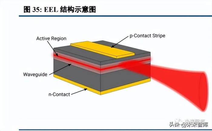 半导体激光器 LD 按照发射光所在位置分为 EEL(边发射激光器)和 SEL(面发射激光器)。其中,EEL 是常见的一类半导体激光器,指的是出射激光一般在激光器芯片的端面,且平行于激光器芯片所在晶圆的表面。EEL 一般包括 FP 激光器、DFB 激光器和 DBR 激光器等,一般腔长较长(在几百 um 到几 mm 之间),光在谐 振的过程中能够获得足够的增益,因此激光器出射功率较高。EEL 的两个端面可以作为谐振腔的反射面,因此 需要抛光和镀膜等处理。SEL 也是广泛应用的激光器,指的是出射激光一般以面发射的形式存在,垂直于所在 晶圆的表面。VCSEL 激光器是最为常见的面发射激光器,全称为 vertical cavity surface emitting laser。该激光器 具备高集成度、低温漂系数、光斑较圆及封装测试成本较低的优势,但也有工艺复杂、成本相对较高等缺点。
