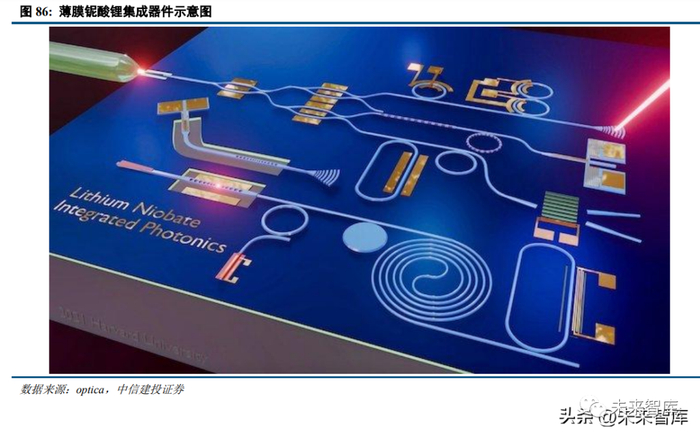 薄膜铌酸锂调制器未来有望应用到数通光模块和激光雷达中。薄膜铌酸锂具有尺寸小、功耗低和易集成等 优点,不过该技术目前尚未成熟。薄膜铌酸锂可以取代体材料铌酸锂的应用场景,包括长距离相干光通信领域 和军事航天等领域。同时,薄膜铌酸锂调制器的应用场景可以拓展到数通光模块和硅基激光雷达中。TFLN 调 制器可以取代高速数通光模块中的硅基调制器和 EA 调制器,也是硅基激光雷达中 OPA 的主流材料之一。