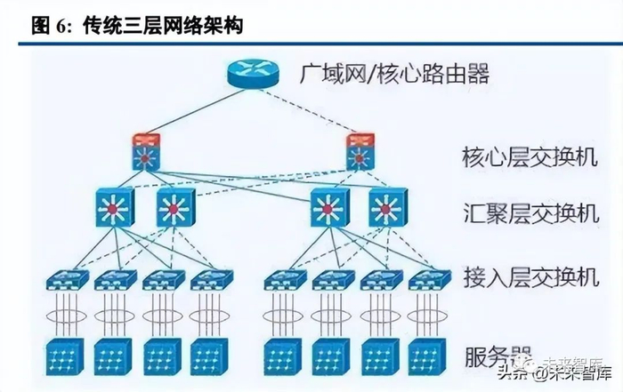 在传统的数据中心中,网络侧主要包括传统树形三层架构和叶脊架构。早期的数据中心一般采用传统的三 层结构,包括接入层、汇聚层和核心层,其中接入层用于连接计算节点与机柜交换机,汇聚层用于接入层的互联,核心层用于汇聚层的互联且实现与外部网络连接。随着数据中心内部东西向流量的快速提升,三层网络架 构的核心层和汇聚层任务加重,性能提升需求高,设备成本将大幅提升。因此,适用于东西向流量的扁平化的 叶脊网络架构应运而生,叶交换机直接与计算节点相连,脊交换机相当于核心交换机,通过 ECMP 动态选择多 条路径。叶脊网络架构具备带宽利用率高、扩展性好、网络延迟可预测和安全性高等优势,在数据中心中实现 广泛的应用。