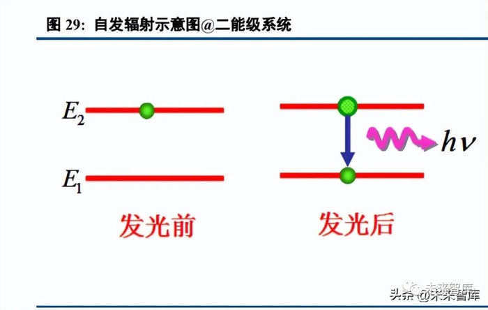 什么是激光?在英文中,激光是 laser,即 light amplification of stimulated emission radiation,通过受激辐射 产生的光放大。什么是受激辐射?受激辐射指的是外来光子与处于高能级的电子发生作用,诱导电子跃迁到低 能级,释放出一个与外来光子具有相同频率、相位、传播方向和偏振状态的光子,从而具备相干性。什么是自 发辐射?与受激辐射相反,指的是在没有外来光子的情况下,处于高能级的原子或者谐振子向低能级自发跃迁 产生光子,这些光子的传播方向和偏振态等性质是无规律分布的,因此不具备相干性。