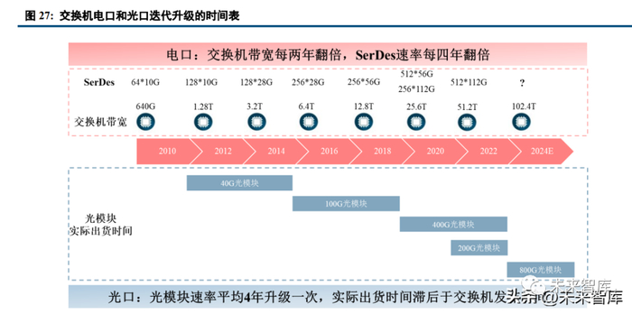 800G 光模块 2022 年底开始小批量出货,2023 年需求主要来自于谷歌和英伟达,2024 年有望大规模出货,并存在时间前移的可能。从交换机的电口来看,SerDes 通道的速率每四年翻倍,数量每两年翻倍,交换机的带 宽每两年翻倍;从光口来看,光模块每 4 年升级一次,实际出货时间是晚于电口 SerDes 及交换机芯片新版发布 的时间。2019 年作为 100G 光模块升级的时间点,市场分成了 200G 和 400G 两条升级路径。但是在 2023 年这 个时间点,市场下一代高速率光模块均指向 800G 光模块,叠加 AIGC 带来的算力和模型竞赛,我们预计北美 各大云厂商和相关科技巨头均有望在 2024 年大量采购 800G 光模块,同时 2023 年也可能提前采购。