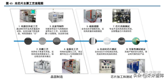 DFB 和 EML 激光器的技术壁垒主要在于外延和光栅工艺。外延工艺是晶圆制造乃至光芯片生产最重要、 技术门槛最高的环节。通常在 DFB 和 EML 的外延工艺中,需要通过 MOCVD 对半导体材料进行精准堆叠,在 有源区多层堆叠的结构中,每层厚度在 10nm 以下级别,此时对层厚的均匀性控制难度极高,对外延设备的理 解要求非常深刻。外延工艺最终影响芯片的性能和可靠性。光栅工艺包括全息光栅和电子束光栅,在涂有光刻 胶的基板上定义出光栅结构的掩膜图形,再通过刻蚀技术转移到衬底上。光栅工艺会影响出光功率、单模良率、芯片波长、极限工作温度特性、模式稳定性和高频特性等。