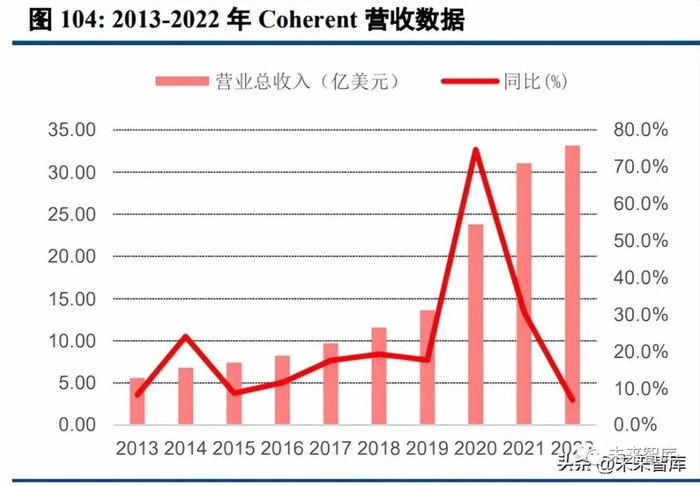 光器件由于其基础属性,可以应用于多个下游市场。公司 1971 年成立,专注于二氧化碳激光器相关光学器 件。成立以来的 51 年内,公司不断新增相关业务。1998 年,公司启动了碳化硅业务;2004 年,公司开展热电 子学业务;2007 年,公司新增激光处理头业务;2010 年,公司新增微光学系统业务;2012 年,公司新增先进 镀膜、国防光学系统和陶瓷金属化合物等业务;2016 年,新增 3D 识别的 VCSEL 阵列产品,RF 和光学外延片;2018 年,新增高功率激光器系统,基于 LC 的 WSS;2019 年,新增高速率光模块、InP 光电子、基于 LCoS 的 WSS,可调激光器等业务;2022 年,新增工业激光器、仪器仪表和激光加工设备等业务。综合来看,Coherent 的下游市场包括通信、消费电子、激光加工、汽车光电子和仪表仪器等领域,市场空间广阔。
