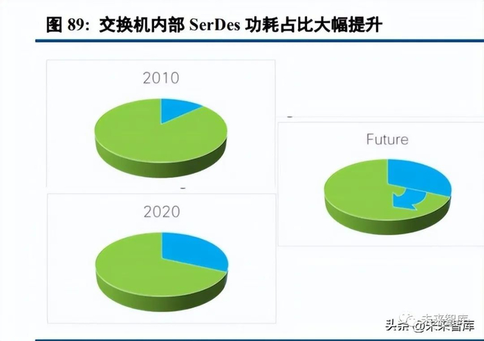 为什么要用 CPO?CPO 交换机主要分为交换机芯片、SerDes 和光学部分,过去 10 年交换机带宽增长了 80 倍。交换机芯片的带宽每两年提升一倍;电接口的 SerDes 数量和速率也在提升,速率从 10G/s 提升到 112G/s, 数量从 64 个通道提升到 51.2T 时代的 512 个通道。交换机带宽从 640G 提升到 51.2T,交换机芯片功耗提升 7.4 倍,每个 Serdes 通道的功耗提升 2.84 倍,结合 Serdes 通道数的增加,总功耗增加 22.7 倍。交换机中 SerDes 的功耗大幅提升。随着单个 SerDes 带宽提升带来功耗的提升,同时结合 SerDes 数量的提 升,未来 SerDes 的总功耗在交换机中的功耗占比将大幅提升。网络部分的功耗在数据中心中的功耗大幅提升:根据 Facebook 的测算,随着数据中心内部流量的大幅提升,网络部分的功耗占比增加明显,到下一代网络部分 的功耗占比将从现在的 2%左右提升到 20%左右。