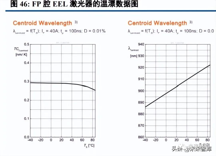 激光雷达领域中的 EEL,一般是采用的 FP 谐振腔,采用的 TO 封装方式。EEL 一般用在两个方面:一是 激光雷达发光源,波长为 905nm 左右;二是光纤激光器的泵浦光源。EEL 具有功率高、产业链成熟、成本低等 优势,同时温漂系数也比较高。温漂系数即表示激光器输出波长随着温度变化而变化的参数,一般 FP 腔的 EEL 的温漂系数为 0.3nm/℃,主要是由于增益介质的温漂系数决定。Osram 的新一代 EEL 产品,其中一侧采用了准 DBR 谐振腔的形式,将温漂系数从 0.3nm/℃降低到 0.1nm/℃左右。公司纳米堆叠的技术使得同一个 TO 封装的 产品包含三颗外延生长的激光器,有效提升光功率。未来国内厂商若要在 EEL 产品上降低温漂系数,需要绕开 相关的专利壁垒,具有较高的难度。