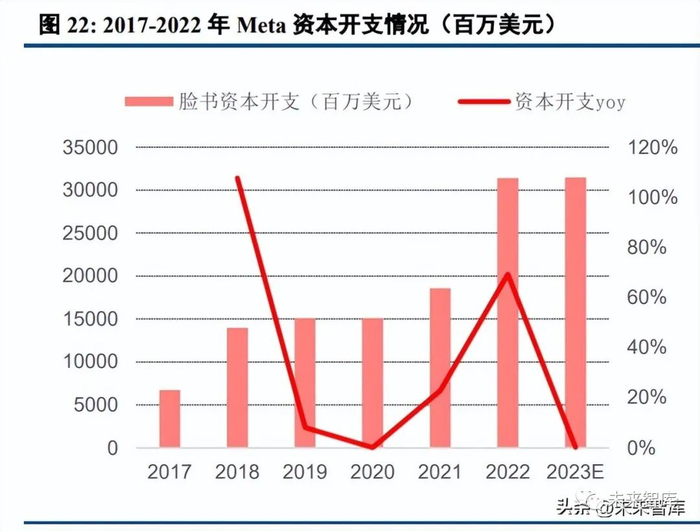 2022Q4,Meta 的资本开支为 90.43 亿美元,同比增长 68.4%。2022 全年资本开支为 314 亿美元左右,同比 增长 69%。公司预计 2023 年资本开支为 300-330 亿美元,低于公司之前 340-370 亿美元的预期,主要原因是数 据中心建设的成本降低,因为新的数据中心架构性价比高,可以同时支持 AI 和 Non-AI 的工作载荷。根据 LightCounting 数据,2022 年 Meta 仍有 40 多个数据中心正在建设和升级,但是对于 200G 的需求有削减,也影 响了今年传统云计算市场的景气度。在 AI 方面,Meta 开源了 LLaMA 大模型系列,参数量为 70 亿-650 亿左右;Meta 近期也发布了图像分割大模型 SAM,可以处理包含多个具有不同形状、大小和外观的对象的复杂场景。同时,Meta 承诺建立人工智能基础设施,并追赶亚马逊和谷歌,这些采用 400G 光模块的场景有可能将采用 800G 光模块。因此,我们认为 Meta 在 2024 年可能大规模采购 800G 光模块。