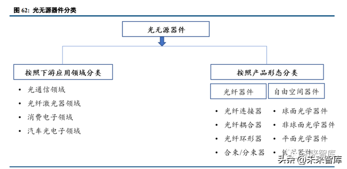光无源器件原指在光纤通信网络中,内部不发生光电能量转换的一类器件。目前光无源器件不断拓宽应 用领域,广泛应用于光通信、消费电子和汽车光电子等领域,其中包括光纤连接器、光定向耦合器、光学隔 离器、光衰减器、滤光片和光学透镜等器件。作为光学设备的重要组成部分,光无源器件在光路中发挥着连接、功率分配、信号衰减和光波分复用等作用,具有高回波损耗、低插入损耗、高可靠性、稳定性、耐磨性 和抗腐蚀性等特点按照产品的形态,主要分为光纤类无源光器件和自由空间类光无源器件。
