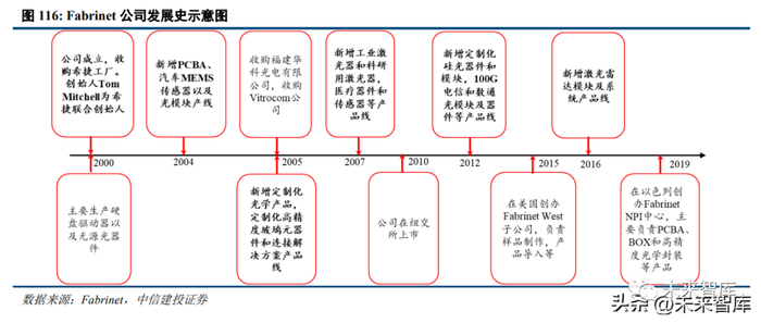 Fabrinet 创立于 2010 年,公司创始人 Tom Mitchell 为希捷联合创始人,同年收购希捷在泰国的工厂。在创 立之后的十几年期间,该公司通过内生和外延不断增加新的产品线,纵向一体化布局,横向不断拓宽市场。其 中包括,2004 年新增 PCBA、汽车 MEMS 传感器以及光模块产线;2005 年新增定制化光学产品,定制化高精 度玻璃元器件和连接解决方案产品线;2007 年新增工业激光器和科研用激光器,医疗器件和传感器等产品线;2012 年新增定制化硅光器件和模块,100G 电信和数通光模块及器件等产品线;2016 年新增激光雷达模块及系 统产品线。参考 Fabrinet,天孚通信也在向激光雷达和医疗检测等领域拓展,公司未来发展空间仍然广阔。