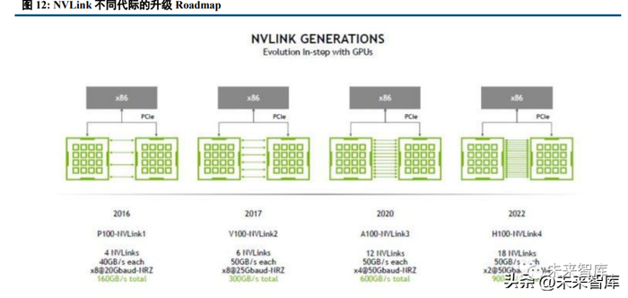 NVLink 带宽远大于网卡侧的 PCIe 带宽,因此若将 NVLink 从服务器内部 GPU 互连拓宽至不同服务器之 间的 GPU 的互连,将显著提升系统的带宽。若要实现不同服务器之间按照 NVLink 协议的 GPU 互连,除了需 要采用 NVSwitch 芯片的物理交换机,还需要物理器件来实现交换机和服务器之间的连接,那么光模块也成为 了重要的组成部分,从而也会大幅增长 800G 光模块的需求。目前该方案仍然处于前沿研发阶段,若要规模化商用仍需时日。但是 NVLink 较高的带宽仍然是非常具有吸引力的,一旦方案成熟,有望快速实现广泛应用。