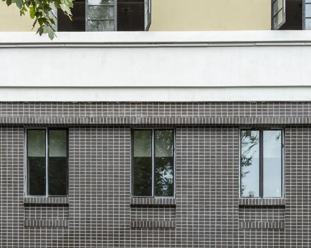 在外立面修缮中,设计恢复了墙面的深色水刷石和局部浅色水刷石,在一、二层立面恢复黑色小方砖的历史材质,以及腰线、勒脚、雨篷及门头的浅色斩假石,从而完整地展现历史建筑的厚重感和沧桑感。