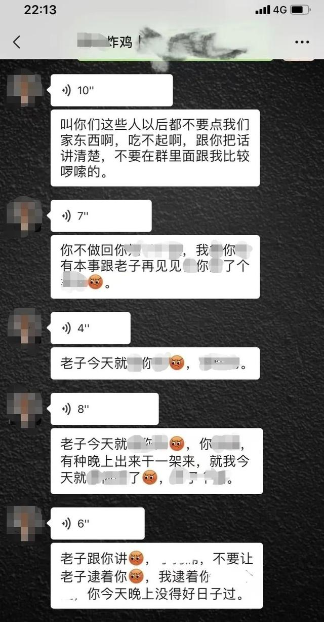 5月13日晚,张先生又在那家店点了一份套餐,两分钟后收到平台短信,被告知商家取消了订单,随后张先生在该店的微信会员群询问为何取消了订单。“他回复说卖完了,然后就把我踢出了群里。”张先生告诉记者,让他气愤的是,大约十多分钟后,他收到了商家私发的多条微信信息,对方用语音对他进行了辱骂,言语十分难听,甚至称“有种晚上出来干一架”。张先生还表示,后来他发现商家还发了朋友圈,询问他人是否知道张先生的电话和地址。气愤的张先生选择了报警。