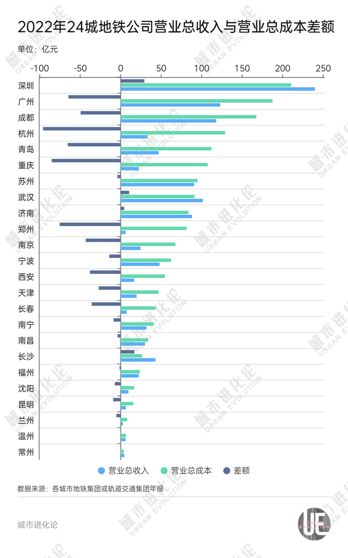 比如,杭州2022年营业总收入33.09亿元,营业总成本是128.95亿元;郑州营业总收入6亿元,营业总成本81.38亿元,相差超过70亿元。