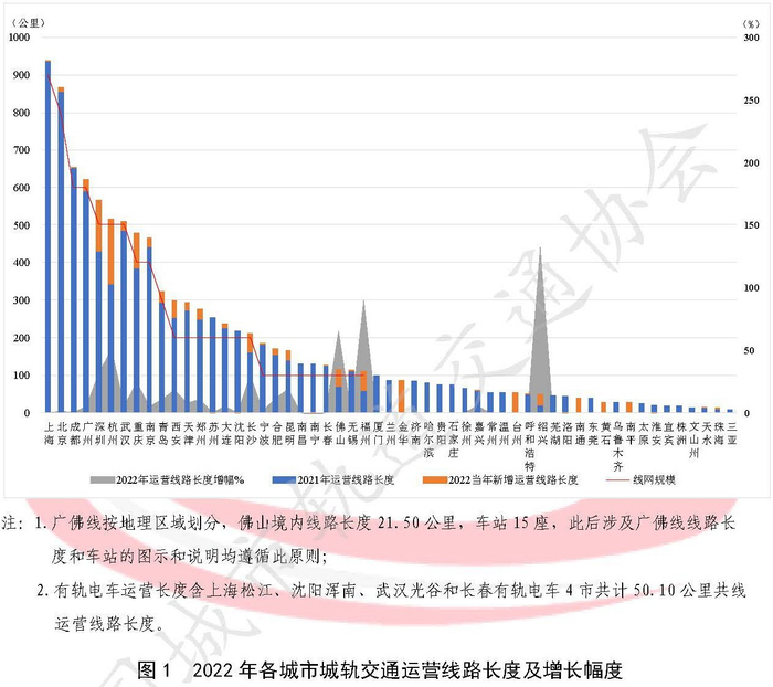 上述报告称,2022年共新增城轨交通运营线路长度1080.63公里,北京、天津等20个城市均有新线或新段开通运营,其中,杭州新增174公里,排名全国第一。此外,深圳新增里程达136.11公里,重庆、福州等城市增量也超过50公里。