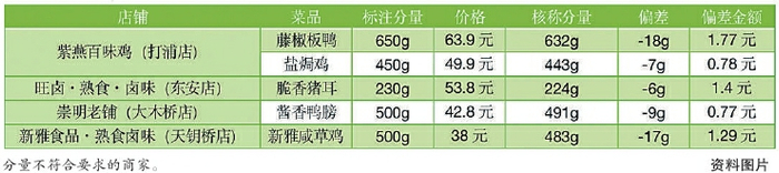 调查结果显示,20款熟食卤味样品有5款分量不足,占比25%。如紫燕百味鸡(打浦店)的藤椒板鸭,标注为650g,价格为63.9元,按规定其允许的最大负偏差为2g,但其核称分量为632g,比标注分量少了18g,低于允许的最大负偏差;新雅食品·熟食卤味(天钥桥店)的新雅咸草鸡,标注为500g,价格为38元,按规定其允许的最大负偏差为2g。但其核称分量为483g,比标注分量少了17g。