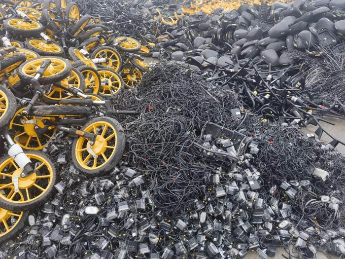记者了解到,报废共享电单车的正规回收流程是将车体上的金属、塑料拆分,按类型分类,经无害化处理之后打碎或融化,使其变回金属和塑料原材料再循环利用。