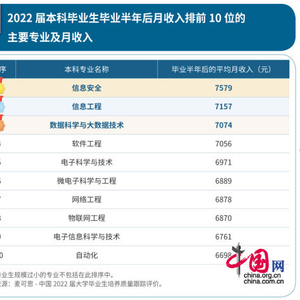 据2023年就业蓝皮书显示,2022届本科毕业生月收入最高的本科专业是信息安全(7579元),其后是信息工程(7157元)、数据科学与大数据技术(7074元)、软件工程(7056元),应届毕业生起薪均超7000元。高薪排行榜排名第5至10位的专业分别为电子科学与技术(6971元)、微电子科学与工程(6889元)、网络工程(6878元)、物联网工程(6870元)、电子信息科学与技术(6761元)、自动化(6698元)。从这10个专业所属的专业类来看,5个属于计算机类,4个属于电子信息类。