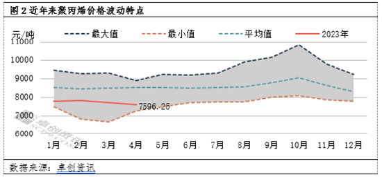 4月国内聚丙烯市场短暂上行后,以震荡走低为主,根据近6年来PP价格波动特点,PP价格运行状态处于偏低水平。据卓创资讯数据统计,以华东聚丙烯拉丝为例,4月均价在7596.25元/吨,环比上月下跌1.26%,同比跌13.16%。分析来看,市场重心走低的主要原因来自供需面的影响,尤其需求端的减弱。