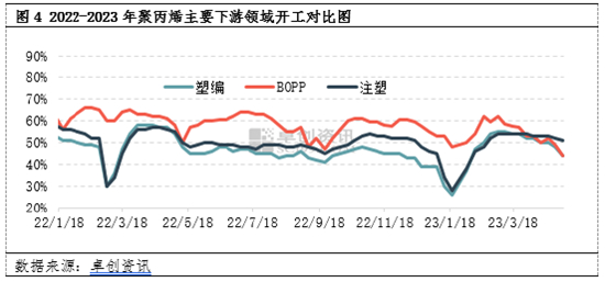 2023年以来,国内聚丙烯生产企业整体开工负荷率在近几年的低位徘徊:1-4月平均开工负荷率降至83.04%,同比去年同期下滑3.19%,开工负荷率最低一度在78%左右。这在一定程度上缓解了供应端的压力,也一定程度上抵消了部分新增产能的冲击,从供应端对市场形成一定支撑。