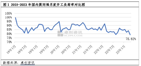 按照以往惯例,上半年4-5月为聚丙烯装置集中检修的相对旺季。2023年也不例外,4月聚丙烯生产企业检修装置密集。据卓创资讯数据统计,2023年4月份国内PP开工负荷率平均在78.62%,较2023年3月份下降5.13个百分点,较去年4月份下降2.97个百分点,创下近5年内的新低。