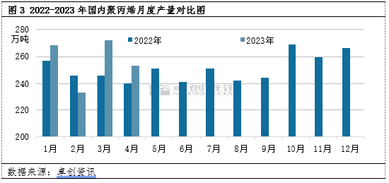 同时从产量来看,4月聚丙烯产量亦是明显高于去年同期。据卓创资讯估算,2023年4月国内PP产量在253.25万吨,环比2023年3月下降6.94%,同比去年4月份增长5.49%。2023年1-4月PP累计产量在1027.58万吨,较去年同期增长3.89%。