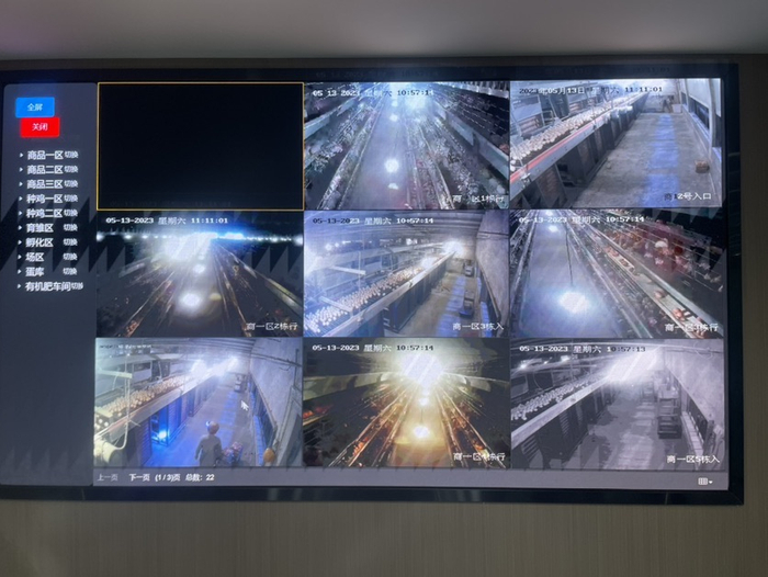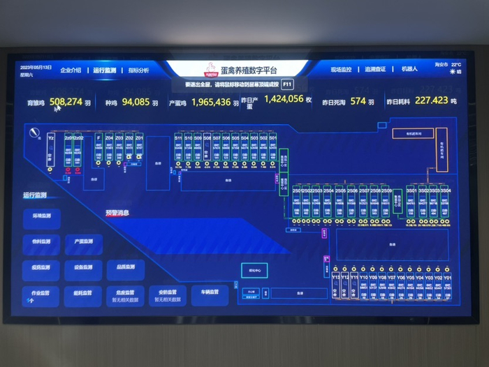 “产蛋鸡1965436羽、昨日产蛋1424056枚、温度22摄氏度、湿度77%、风机运行数10台……”打开禽蛋养殖数字平台,各鸡舍内鸡群和环境等信息被做成统计数据和图表,清晰直观地显示在屏幕上,再点击“远程巡查”,育雏区、孵化区内的实时场景便可通过监控探头尽收眼底。
