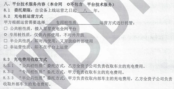 根据运营需要,辉县市交通运输局选择“专用桩性质”方式进行托管,委托期限为自设备上线运营之日起8年,在专用桩性质的委托方式下,由甲方负责收取车主的充电费用。
