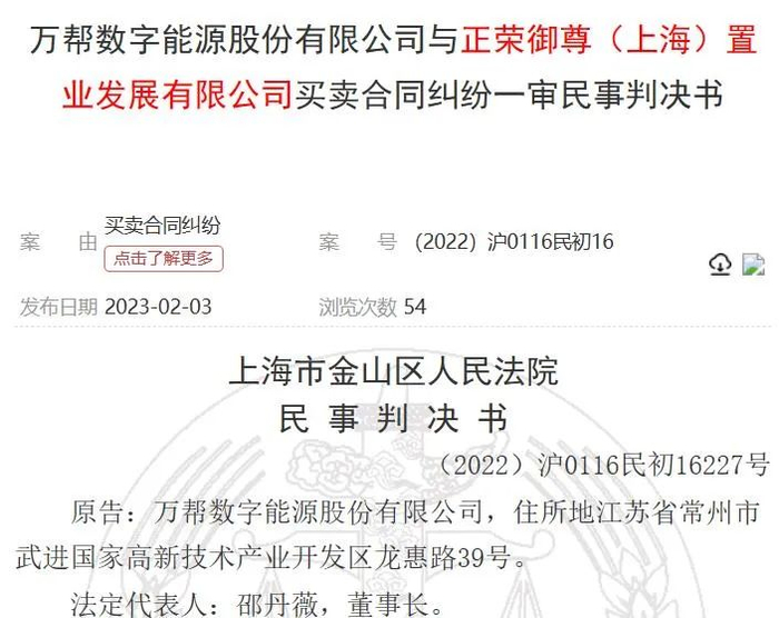 今年2月,中国裁判文书网披露了万帮数字能源与正荣御尊(上海)置业发展有限公司(下称:正荣置业)买卖合同纠纷一审民事判决书。判决书显示,