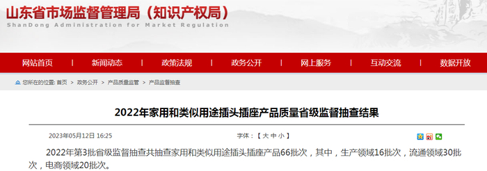 中国质量新闻网讯 近日,山东省市场监督管理局公布2022年家用和类似用途插头插座产品质量省级监督抽查结果。
