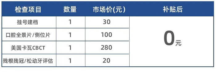 免费检查包含:挂号、口腔全景片/侧位片、口腔CBCT、残根残冠/松动牙评估。