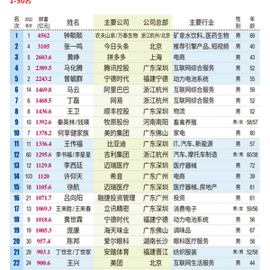 榜单显示,农夫山泉董事长钟睒睒连续第三年夺冠,远远超过第二名1400多亿元;字节跳动创始人张一鸣以身家3105亿元排第二;拼多多创始人黄峥身家2603.6亿元位居第三。