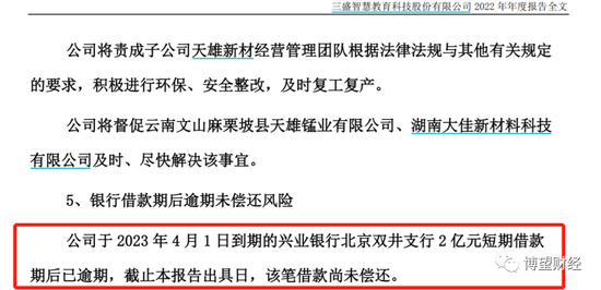根据*ST三盛2022年财报显示,“公司于2023年4月1日到期的兴业银行北京双井支行2亿元短期借款期后已逾期,截止本报告出具日,该笔借款尚未偿还”。