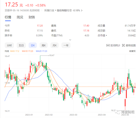 近日兴业银行股价也在持续回落,已由5月9日的收盘价17.56元/股跌至5月15日收盘价的17.25元/股。