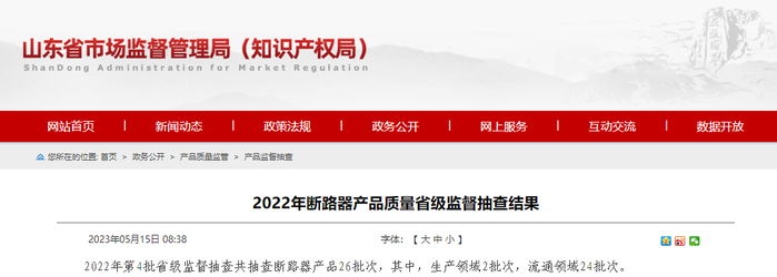 山东省市场监督管理局公布2022年断路器产品质量省级监督抽查结果